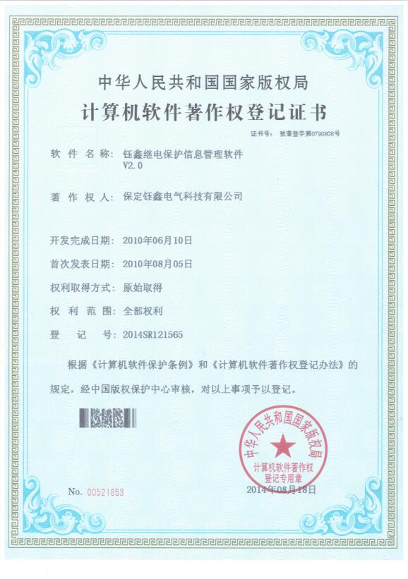 軟件名稱:鈺鑫繼電保護信息管理軟件V2.0   著作權(quán)人:保定鈺鑫電氣科技有限公司