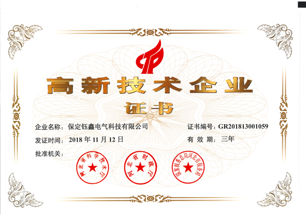 高新技術(shù)企業(yè)證書    企業(yè)名稱:保定鈺鑫電氣科技有限公司      證書編號(hào):GR201813001059
