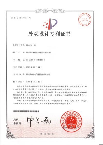 蓄電池上蓋外觀設(shè)計(jì)專利證書