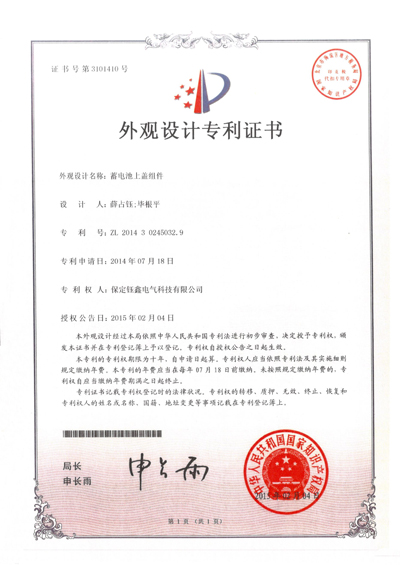 蓄電池上蓋組件外觀設(shè)計(jì)專利證書