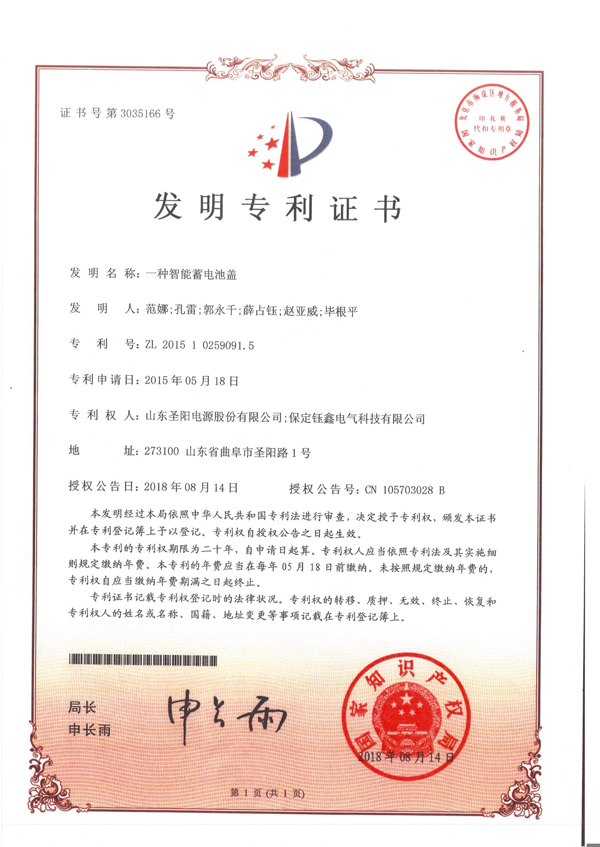發(fā)明名稱:一種智能蓄電池蓋,專利號(hào):ZL 2015 1 0259091.5,專利申請(qǐng)日:2015年05月18日,專利權(quán)人:山東圣陽電源股份有限公司;保定鈺鑫電氣科技有限公司,授權(quán)公告日:2018年08月14日