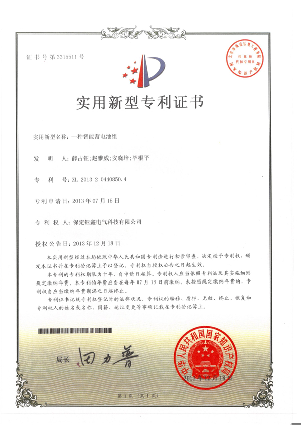 實用新型名稱:一種智能蓄電池組,專利號:ZL 2013 2 0440850.4,專利申請日:2013年07月15日,專利權(quán)人:保定鈺鑫電氣科技有限公司,授權(quán)公告日:2013年12月18日