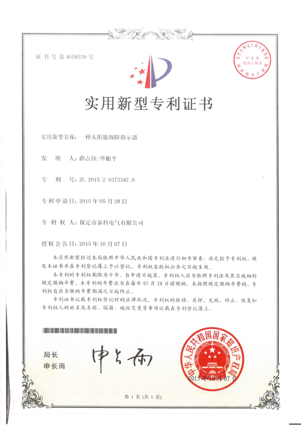 實(shí)用新型名稱:一種太陽能故障指示器,專利號(hào):ZL 2015 2 0373347.0,專利申請(qǐng)日:2015年05月28日,專利權(quán)人:保定市泰科電氣有限公司,授權(quán)公告日:2015年10月07日