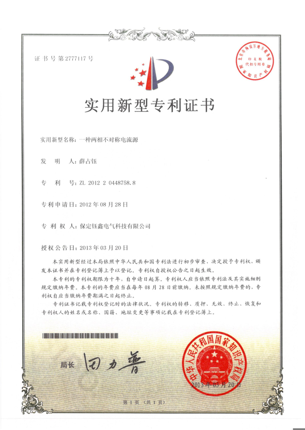 實(shí)用新型名稱:一種兩相不對(duì)稱電流源,專利號(hào):ZL 2012 2 0448758.8,專利申請(qǐng)日:2012年08月28日,專利權(quán)人:保定鈺鑫電氣科技有限公司,授權(quán)公告日:2013年03月20日