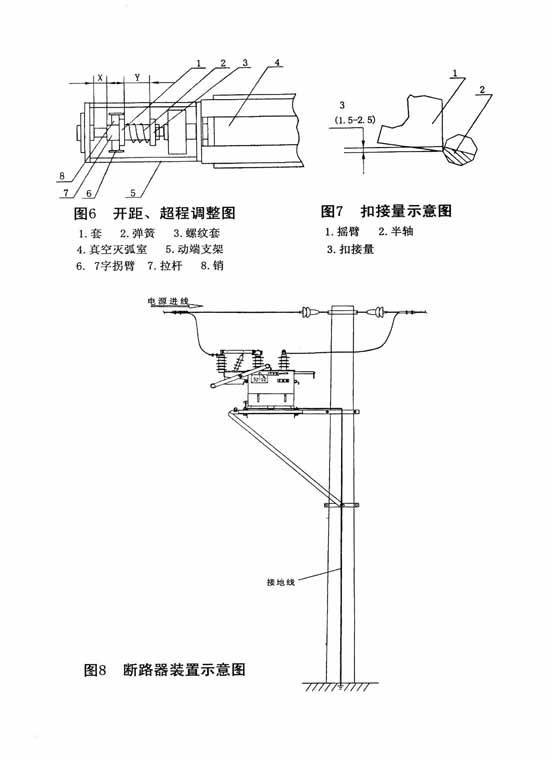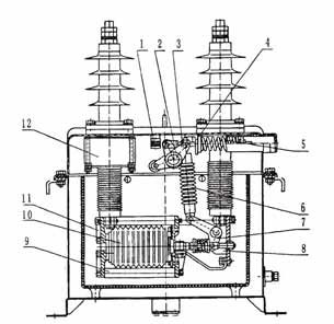 The 1 brake buffer 2 three-phase main shaft crank arm bracket 5 3 4 opening spring 6 insulating rod 7.7 words crank arm 8 end bracket 9 insulating rod 10 vacuum interrupters 11 static end bracket 12 current transformer