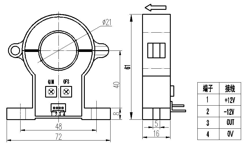 “電流測量”:4位端子連接外置開合式直流霍爾電流傳感器上對應的端子。開合式直流霍爾電流傳感器尺寸及端子定義如下圖所示,傳感器的“+12V”接裝置的“12V”,傳感器“-12V”接裝置的“-12V”,傳感器的“OUT”接裝置的“IN”,傳感器的“0V”接裝置的“0V”。電流流過的方向和傳感器上箭頭一致時,測量結果為正數,反之為負數。