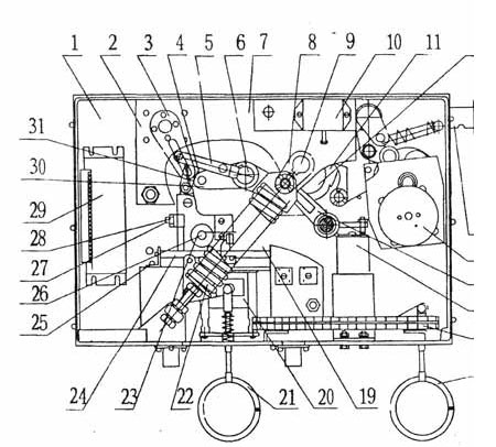 1. 底板2.輔助開(kāi)關(guān)3.拐臂4.傳動(dòng)軸套5.螺桿6.主軸7.支撐板8.儲(chǔ)能拐臂9.儲(chǔ)能軸10.行程開(kāi)關(guān)11.棘輪12.凸輪13.儲(chǔ)能手柄14.儲(chǔ)能電機(jī)15.定位件16.合閘脫扣器17.接線端子18.手動(dòng)合閘拉環(huán)19.聯(lián)鎖裝置20.分閘脫扣器21.手動(dòng)分閘拉環(huán)22.合閘彈簧23.彎板24.脫扣器25.調(diào)節(jié)螺釘26.半軸27.調(diào)節(jié)螺釘28.調(diào)節(jié)螺釘29.負(fù)荷控制器30.搖臂31.滾輪
