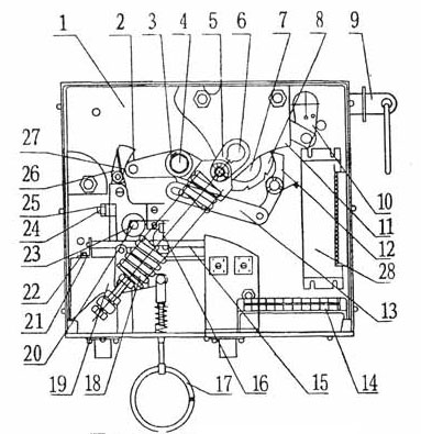 1.底板2..傳動(dòng)軸套3.螺桿4.主軸5.儲(chǔ)能拐臂6.儲(chǔ)能軸7.凸輪8.棘輪9.儲(chǔ)能手柄10.拐臂11.支撐板12.保持棘爪13.連扳14.接線端子15.脫扣軸16.頂桿17.手動(dòng)合閘拉環(huán)18.合閘彈簧19.過(guò)流脫扣器20. 半軸21.支撐板22.彎板23.調(diào)節(jié)螺釘24. 調(diào)節(jié)螺釘25.搖臂26.滾輪27.復(fù)合控制器